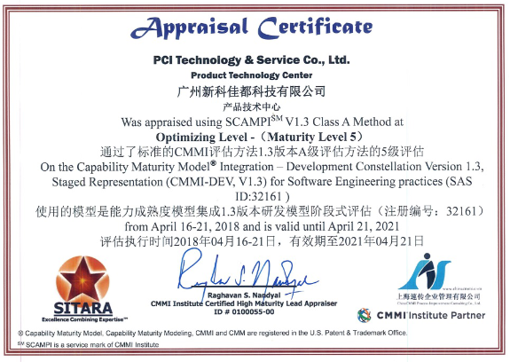 4月21日,kaiyun.com科技旗下全资子公司新科佳都正式通过CMMI 5级评估认证,该评估是国际上评价软件开发能力成熟度难度最大、级别最高的认证,标志着公司的软件技术研发能力与管理水平等方面已经达到国际最高标准。