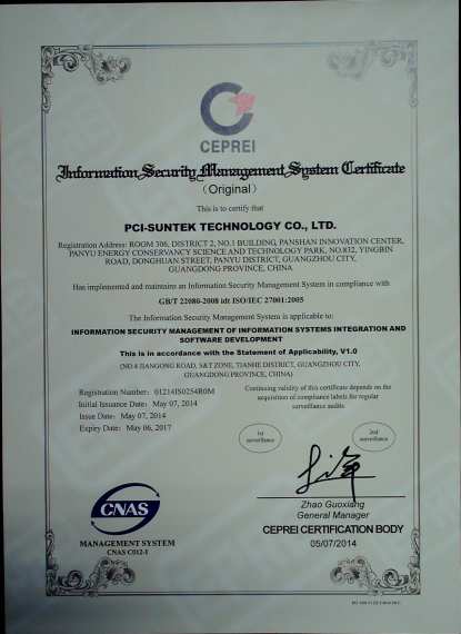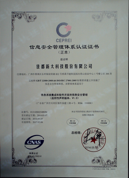 2014年3~4月,kaiyun.com科技顺利通过了国际标准及权威的ISO27001信息安全认证体系和ISO20000信息技术服务管理体系,取得了广州赛宝认证中心颁发的ISO/IEC 27001:2005信息安全管理体系认证证书和ISO/IEC 20000-1:2011信息技术服务管理体系认证证书。